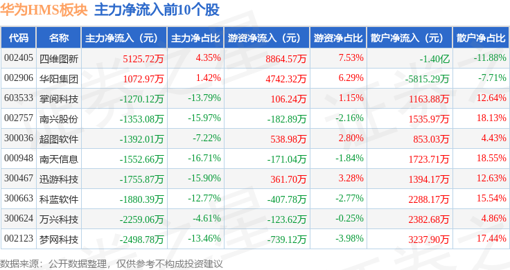 从资金流向上来看,当日华为HMS板块主力资金净流出15.74亿元,游资资金净流入8.15亿元,散户资金净流入7.58亿元。华为HMS板块个股资金流向见下表: