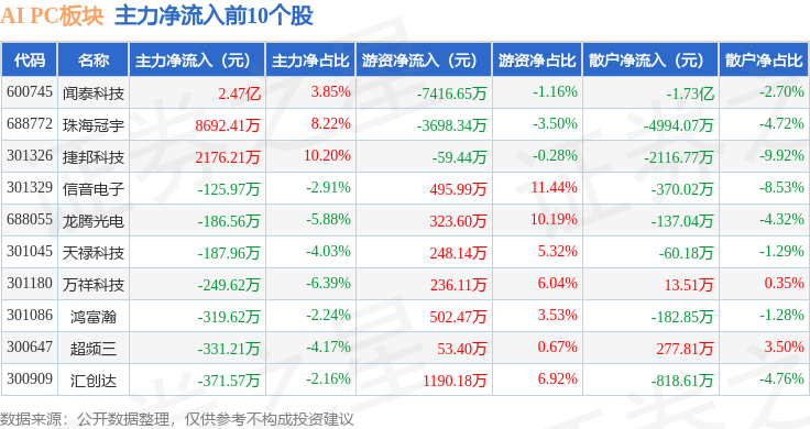 从资金流向上来看,当日AI PC板块主力资金净流出21.75亿元,游资资金净流入2.63亿元,散户资金净流入19.12亿元。AI PC板块个股资金流向见下表: