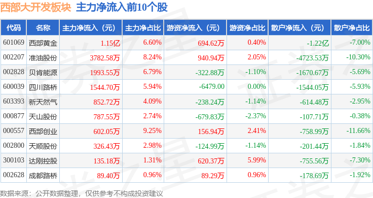 从资金流向上来看,当日西部大开发板块主力资金净流出16.47亿元,游资资金净流入3.63亿元,散户资金净流入12.84亿元。西部大开发板块个股资金流向见下表: