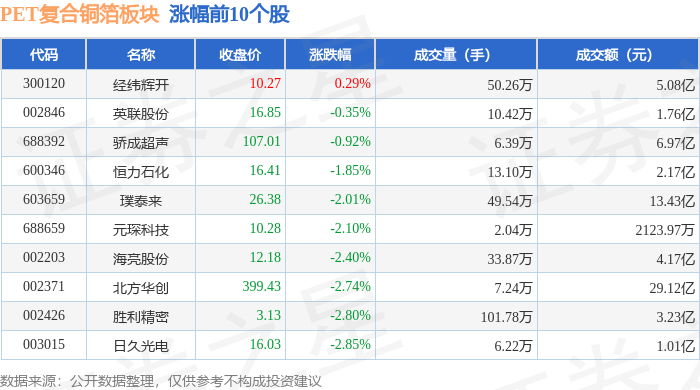 证券之星消息,10月17日PET复合铜箔板块较上一交易日下跌3.12%,江南新材领跌。当日上证指数报收于3839.76,下跌1.95%。深证成指报收于12688.94,下跌3.04%。PET复合铜箔板块个股涨跌见下表: