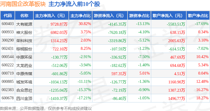 从资金流向上来看,当日河南国企改革板块主力资金净流出2.44亿元,游资资金净流出1.9亿元,散户资金净流入4.34亿元。河南国企改革板块个股资金流向见下表: