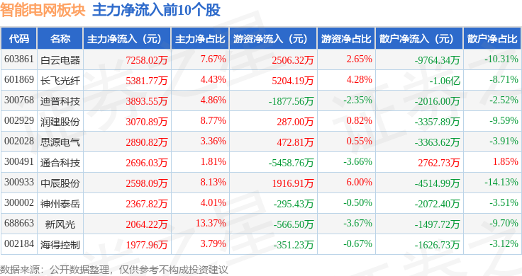 从资金流向上来看,当日智能电网板块主力资金净流出93.06亿元,游资资金净流入20.25亿元,散户资金净流入72.81亿元。智能电网板块个股资金流向见下表: