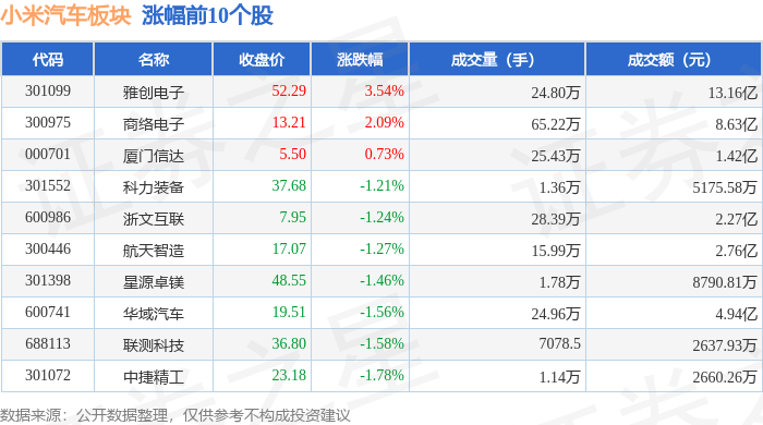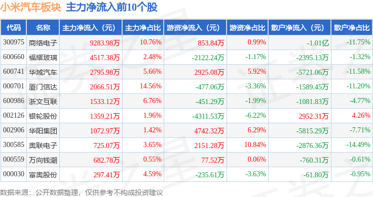 从资金流向上来看,当日小米汽车板块主力资金净流出42.57亿元,游资资金净流入9.49亿元,散户资金净流入33.08亿元。小米汽车板块个股资金流向见下表: