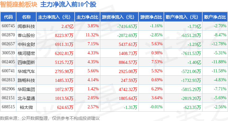 从资金流向上来看,当日智能座舱板块主力资金净流出24.16亿元,游资资金净流入9.41亿元,散户资金净流入14.75亿元。智能座舱板块个股资金流向见下表: