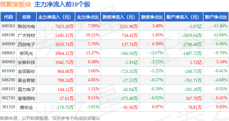 从资金流向上来看,当日核聚变板块主力资金净流出40.96亿元,游资资金净流入1.83亿元,散户资金净流入39.13亿元。核聚变板块个股资金流向见下表: