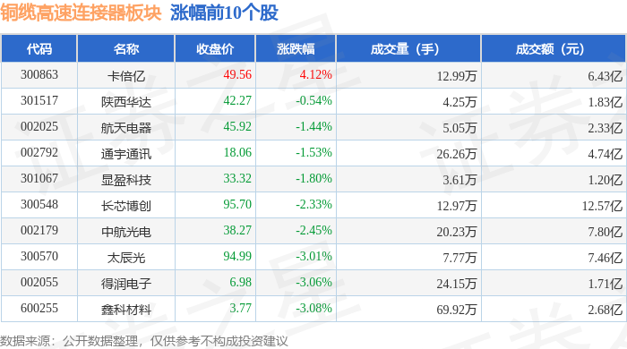 从资金流向上来看,当日铜缆高速连接器板块主力资金净流出32.9亿元,游资资金净流入12.34亿元,散户资金净流入20.56亿元。铜缆高速连接器板块个股资金流向见下表: