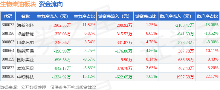 从资金流向上来看,当日生物柴油板块主力资金净流出589.67万元,游资资金净流入438.54万元,散户资金净流入151.13万元。生物柴油板块个股资金流向见下表: