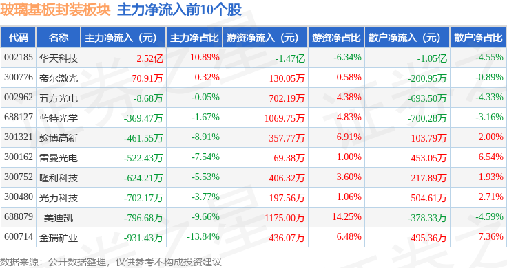 从资金流向上来看,当日玻璃基板封装板块主力资金净流出12.71亿元,游资资金净流入2.48亿元,散户资金净流入10.23亿元。玻璃基板封装板块个股资金流向见下表: