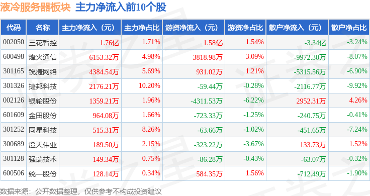 从资金流向上来看,当日液冷服务器板块主力资金净流出84.01亿元,游资资金净流入23.62亿元,散户资金净流入60.39亿元。液冷服务器板块个股资金流向见下表: