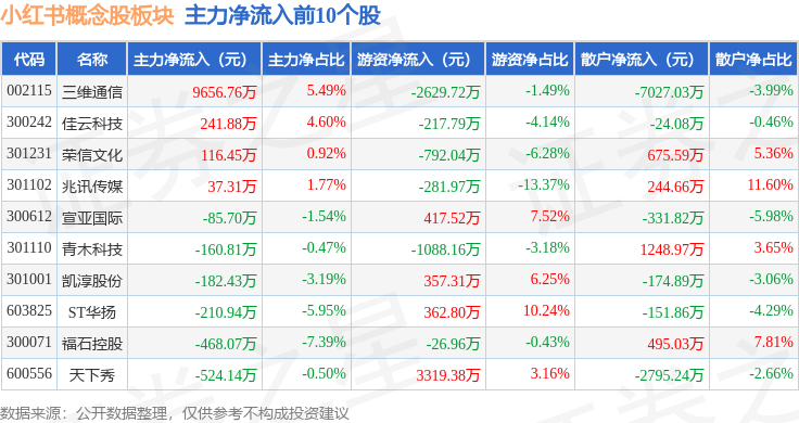 从资金流向上来看,当日小红书概念股板块主力资金净流出8.03亿元,游资资金净流出1.05亿元,散户资金净流入9.09亿元。小红书概念股板块个股资金流向见下表: