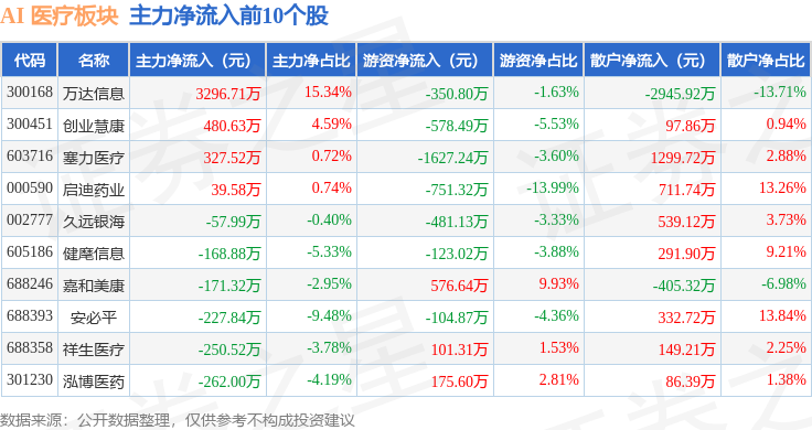 从资金流向上来看,当日AI 医疗板块主力资金净流出3.18亿元,游资资金净流入5986.0万元,散户资金净流入2.58亿元。AI 医疗板块个股资金流向见下表: