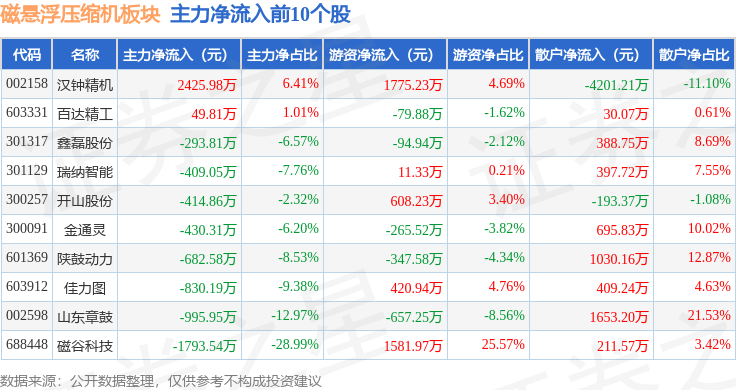 从资金流向上来看,当日磁悬浮压缩机板块主力资金净流出2.39亿元,游资资金净流入3721.13万元,散户资金净流入2.02亿元。磁悬浮压缩机板块个股资金流向见下表:
