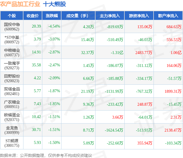 个股表现方面,农产品加工行业当日领跌股为国投中鲁(600962),该股当日报收20.39,下跌4.54%,成交量4.2万,主力资金净流出819.69万元。*ST中基(000972)以下跌3.07%紧随其后,该股当日成交量15.46万,主力资金净流出510.49万元。除此之外,中粮糖业(600737)、一致魔芋(920273)、田野股份(920023)均进入当日熊股之列。具体个股列表见下表: