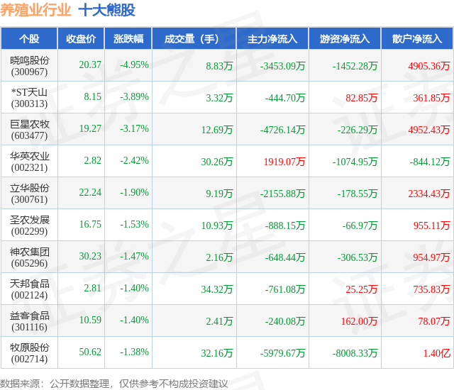 个股表现方面,养殖业行业当日领跌股为晓鸣股份(300967),该股当日报收20.37,下跌4.95%,成交量8.83万,主力资金净流出3453.09万元。*ST天山(300313)以下跌3.89%紧随其后,该股当日成交量3.32万,主力资金净流出444.7万元。除此之外,巨星农牧(603477)、华英农业(002321)、立华股份(300761)均进入当日熊股之列。具体个股列表见下表: