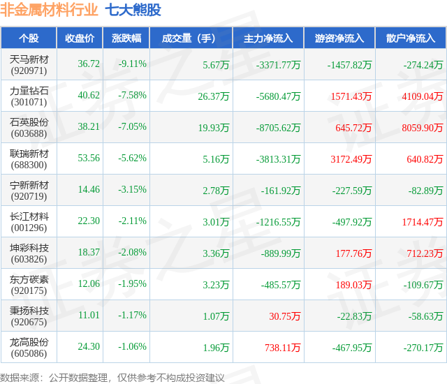 个股表现方面,非金属材料行业当日领跌股为天马新材(920971),该股当日报收36.72,下跌9.11%,成交量5.67万,主力资金净流出3371.77万元。力量钻石(301071)以下跌7.58%紧随其后,该股当日成交量26.37万,主力资金净流出5680.47万元。除此之外,石英股份(603688)、联瑞新材(688300)、宁新新材(920719)均进入当日熊股之列。具体个股列表见下表: