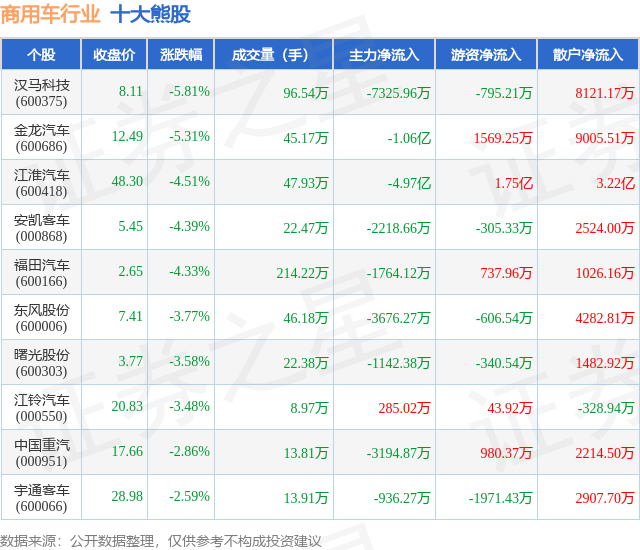 个股表现方面,商用车行业当日领跌股为汉马科技(600375),该股当日报收8.11,下跌5.81%,成交量96.54万,主力资金净流出7325.96万元。金龙汽车(600686)以下跌5.31%紧随其后,该股当日成交量45.17万,主力资金净流出1.06亿元。除此之外,江淮汽车(600418)、安凯客车(000868)、福田汽车(600166)均进入当日熊股之列。具体个股列表见下表: