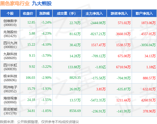 个股表现方面,黑色家电行业当日领跌股为创维数字(000810),该股当日报收12.85,下跌5.24%,成交量22.7万,主力资金净流出2444.08万元。兆驰股份(002429)以下跌4.23%紧随其后,该股当日成交量81.62万,主力资金净流出8217.21万元。除此之外,四川九洲(000801)、九联科技(688609)、四川长虹(600839)均进入当日熊股之列。具体个股列表见下表: