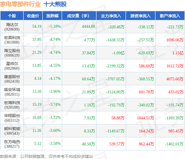 个股表现方面,家电零部件行业当日领跌股为海达尔(920699),该股当日报收54.19,下跌5.18%,成交量4445.0,主力资金净流出320.48万元。宏昌科技(301008)以下跌4.74%紧随其后,该股当日成交量4.77万,主力资金净流出1438.55万元。除此之外,海立股份(600619)、星帅尔(002860)、康盛股份(002418)均进入当日熊股之列。具体个股列表见下表: