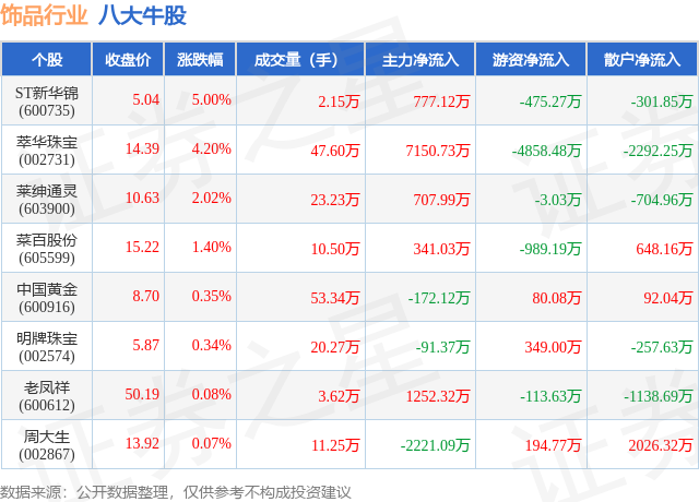 个股表现方面,饰品行业当日领涨股为ST新华锦(600735),该股当日报收5.04,上涨5.0%,成交量2.15万,主力资金净流入777.12万元。萃华珠宝(002731)以上涨4.2%紧随其后,该股当日成交量47.6万,主力资金净流入7150.73万元。除此之外,莱绅通灵(603900)、菜百股份(605599)、中国黄金(600916)均进入当日牛股之列。具体个股列表见下表: