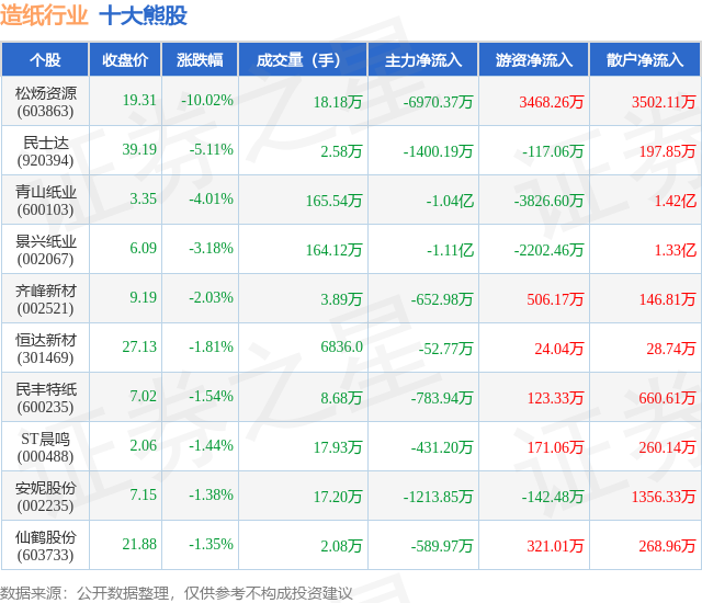 个股表现方面,造纸行业当日领跌股为松炀资源(603863),该股当日报收19.31,下跌10.02%,成交量18.18万,主力资金净流出6970.37万元。民士达(920394)以下跌5.11%紧随其后,该股当日成交量2.58万,主力资金净流出1400.19万元。除此之外,青山纸业(600103)、景兴纸业(002067)、齐峰新材(002521)均进入当日熊股之列。具体个股列表见下表: