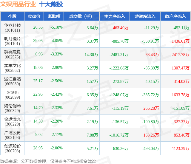 个股表现方面,文娱用品行业当日领跌股为华立科技(301011),该股当日报收26.55,下跌5.18%,成交量3.64万,主力资金净流入463.4万元。明月镜片(301101)以下跌4.05%紧随其后,该股当日成交量3.37万,主力资金净流出885.7万元。除此之外,群兴玩具(002575)、实丰文化(002862)、浙江自然(605080)均进入当日熊股之列。具体个股列表见下表: