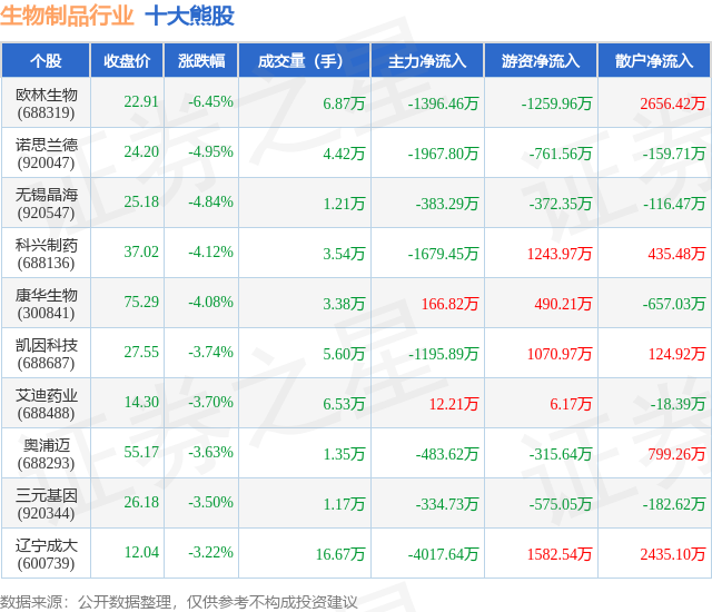 个股表现方面,生物制品行业当日领跌股为欧林生物(688319),该股当日报收22.91,下跌6.45%,成交量6.87万,主力资金净流出1396.46万元。诺思兰德(920047)以下跌4.95%紧随其后,该股当日成交量4.42万,主力资金净流出1967.8万元。除此之外,无锡晶海(920547)、科兴制药(688136)、康华生物(300841)均进入当日熊股之列。具体个股列表见下表: