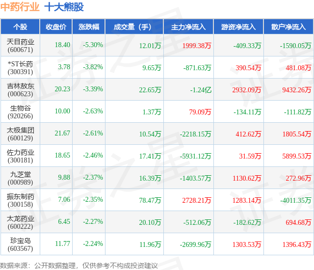 个股表现方面,中药行业当日领跌股为天目药业(600671),该股当日报收18.4,下跌5.3%,成交量12.01万,主力资金净流入1999.38万元。*ST长药(300391)以下跌3.82%紧随其后,该股当日成交量9.65万,主力资金净流出871.63万元。除此之外,吉林敖东(000623)、生物谷(920266)、太极集团(600129)均进入当日熊股之列。具体个股列表见下表: