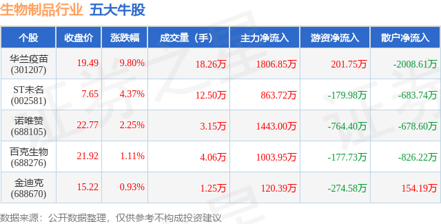 个股表现方面,生物制品行业当日领涨股为华兰疫苗(301207),该股当日报收19.49,上涨9.8%,成交量18.26万,主力资金净流入1806.85万元。ST未名(002581)以上涨4.37%紧随其后,该股当日成交量12.5万,主力资金净流入863.72万元。除此之外,诺唯赞(688105)、百克生物(688276)、金迪克(688670)均进入当日牛股之列。具体个股列表见下表: