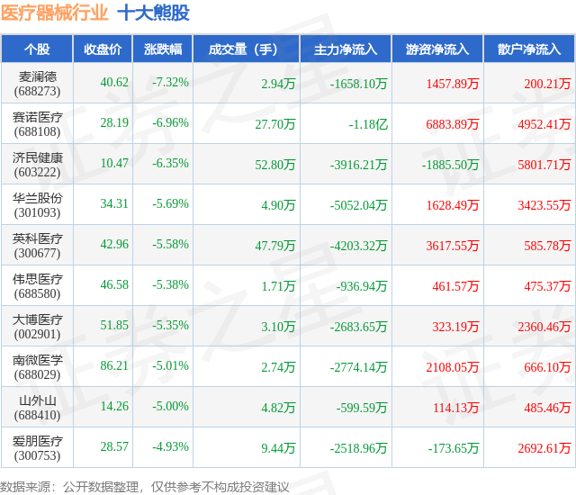 个股表现方面,医疗器械行业当日领跌股为麦澜德(688273),该股当日报收40.62,下跌7.32%,成交量2.94万,主力资金净流出1658.1万元。赛诺医疗(688108)以下跌6.96%紧随其后,该股当日成交量27.7万,主力资金净流出1.18亿元。除此之外,济民健康(603222)、华兰股份(301093)、英科医疗(300677)均进入当日熊股之列。具体个股列表见下表: