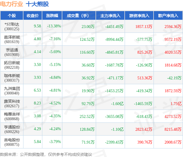 个股表现方面,电力行业当日领跌股为*ST聆达(300125),该股当日报收9.58,下跌13.38%,成交量23.0万,主力资金净流出4451.49万元。嘉泽新能(601619)以下跌7.16%紧随其后,该股当日成交量124.52万,主力资金净流出8994.44万元。除此之外,京运通(601908)、拓日新能(002218)、珈伟新能(300317)均进入当日熊股之列。具体个股列表见下表: