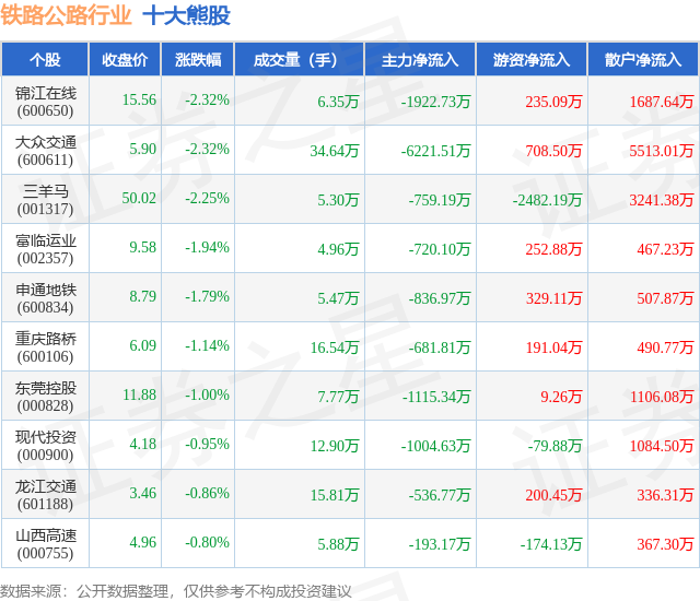 个股表现方面,铁路公路行业当日领跌股为锦江在线(600650),该股当日报收15.56,下跌2.32%,成交量6.35万,主力资金净流出1922.73万元。大众交通(600611)以下跌2.32%紧随其后,该股当日成交量34.64万,主力资金净流出6221.51万元。除此之外,三羊马(001317)、富临运业(002357)、申通地铁(600834)均进入当日熊股之列。具体个股列表见下表: