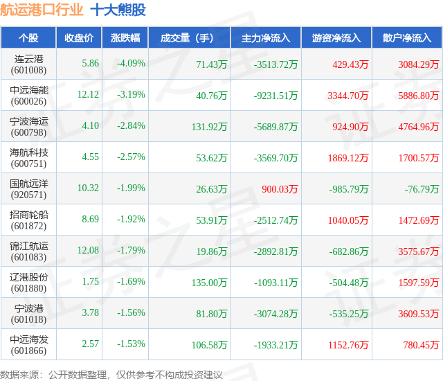 个股表现方面,航运港口行业当日领跌股为连云港(601008),该股当日报收5.86,下跌4.09%,成交量71.43万,主力资金净流出3513.72万元。中远海能(600026)以下跌3.19%紧随其后,该股当日成交量40.76万,主力资金净流出9231.51万元。除此之外,宁波海运(600798)、海航科技(600751)、国航远洋(920571)均进入当日熊股之列。具体个股列表见下表: