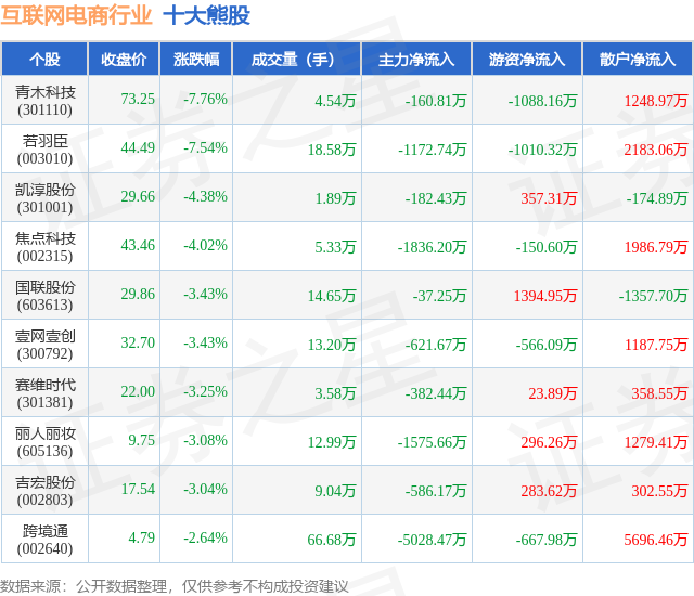 个股表现方面,互联网电商行业当日领跌股为青木科技(301110),该股当日报收73.25,下跌7.76%,成交量4.54万,主力资金净流出160.81万元。若羽臣(003010)以下跌7.54%紧随其后,该股当日成交量18.58万,主力资金净流出1172.74万元。除此之外,凯淳股份(301001)、焦点科技(002315)、国联股份(603613)均进入当日熊股之列。具体个股列表见下表: