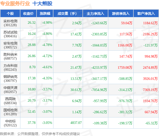 个股表现方面,专业服务行业当日领跌股为实朴检测(301228),该股当日报收26.32,下跌4.98%,成交量2.94万,主力资金净流出1243.66万元。苏试试验(300416)以下跌4.86%紧随其后,该股当日成交量17.42万,主力资金净流出2303.85万元。除此之外,安车检测(300572)、胜科纳米(688757)、力合科创(002243)均进入当日熊股之列。具体个股列表见下表: