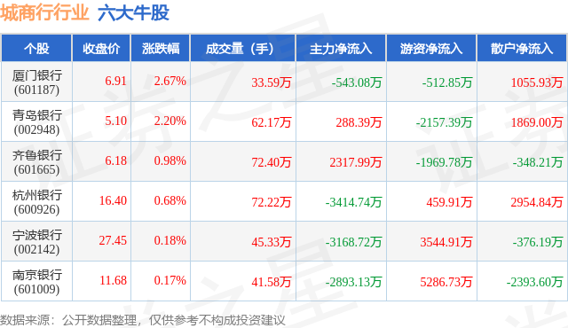 个股表现方面,城商行行业当日领涨股为厦门银行(601187),该股当日报收6.91,上涨2.67%,成交量33.59万,主力资金净流出543.08万元。青岛银行(002948)以上涨2.2%紧随其后,该股当日成交量62.17万,主力资金净流入288.39万元。除此之外,齐鲁银行(601665)、杭州银行(600926)、宁波银行(002142)均进入当日牛股之列。具体个股列表见下表: