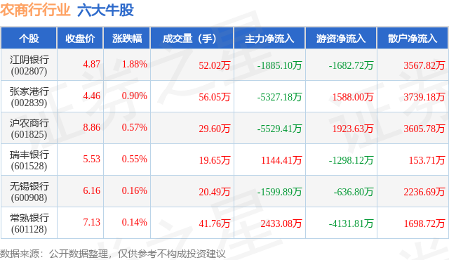 个股表现方面,农商行行业当日领涨股为江阴银行(002807),该股当日报收4.87,上涨1.88%,成交量52.02万,主力资金净流出1885.1万元。张家港行(002839)以上涨0.9%紧随其后,该股当日成交量56.05万,主力资金净流出5327.18万元。除此之外,沪农商行(601825)、瑞丰银行(601528)、无锡银行(600908)均进入当日牛股之列。具体个股列表见下表: