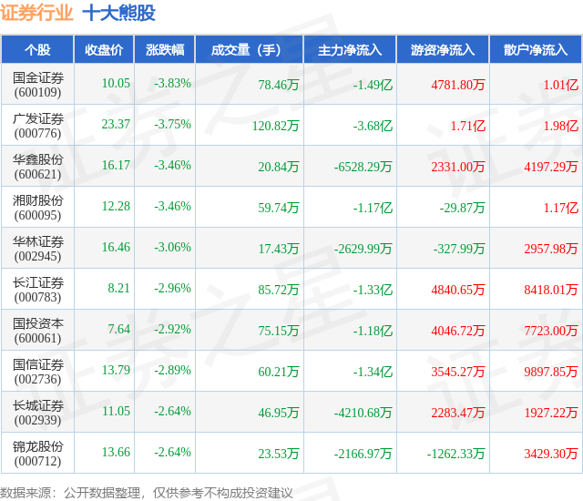 个股表现方面,证券行业当日领跌股为国金证券(600109),该股当日报收10.05,下跌3.83%,成交量78.46万,主力资金净流出1.49亿元。广发证券(000776)以下跌3.75%紧随其后,该股当日成交量120.82万,主力资金净流出3.68亿元。除此之外,华鑫股份(600621)、湘财股份(600095)、华林证券(002945)均进入当日熊股之列。具体个股列表见下表: