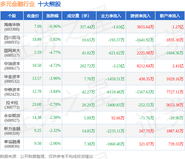 个股表现方面,多元金融行业当日领跌股为海南华铁(603300),该股当日报收7.09,下跌6.96%,成交量357.44万,主力资金净流出1.63亿元。四川双马(000935)以下跌5.82%紧随其后,该股当日成交量10.65万,主力资金净流出193.37万元。除此之外,国网英大(600517)、中油资本(000617)、华金资本(000532)均进入当日熊股之列。具体个股列表见下表: