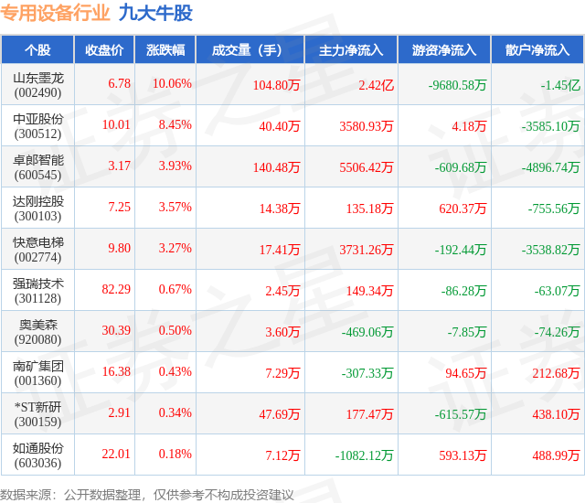 个股表现方面,专用设备行业当日领涨股为山东墨龙(002490),该股当日报收6.78,上涨10.06%,成交量104.8万,主力资金净流入2.42亿元。中亚股份(300512)以上涨8.45%紧随其后,该股当日成交量40.4万,主力资金净流入3580.93万元。除此之外,卓郎智能(600545)、达刚控股(300103)、快意电梯(002774)均进入当日牛股之列。具体个股列表见下表: