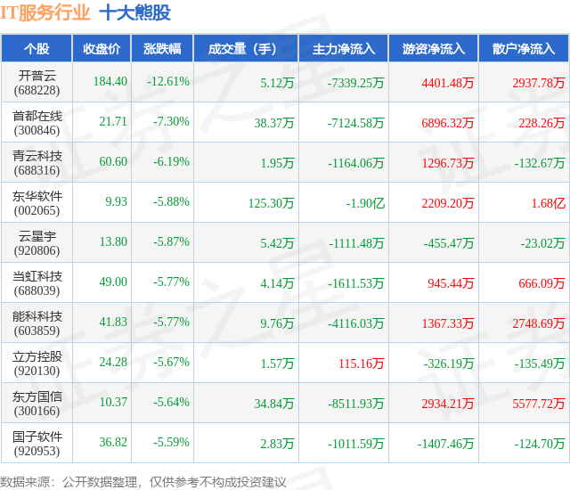 个股表现方面,IT服务行业当日领跌股为开普云(688228),该股当日报收184.4,下跌12.61%,成交量5.12万,主力资金净流出7339.25万元。首都在线(300846)以下跌7.3%紧随其后,该股当日成交量38.37万,主力资金净流出7124.58万元。除此之外,青云科技(688316)、东华软件(002065)、云星宇(920806)均进入当日熊股之列。具体个股列表见下表: