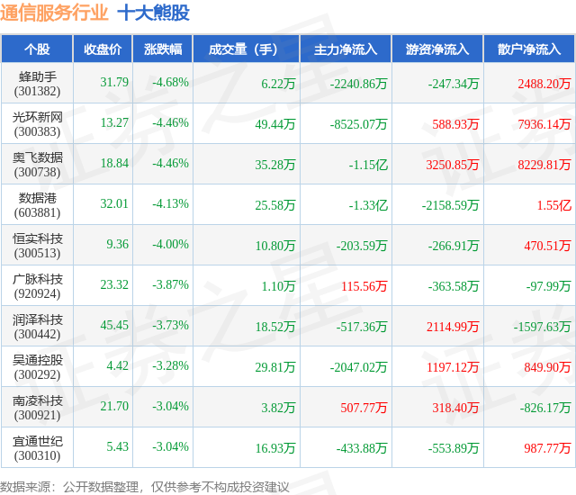 个股表现方面,通信服务行业当日领跌股为蜂助手(301382),该股当日报收31.79,下跌4.68%,成交量6.22万,主力资金净流出2240.86万元。光环新网(300383)以下跌4.46%紧随其后,该股当日成交量49.44万,主力资金净流出8525.07万元。除此之外,奥飞数据(300738)、数据港(603881)、恒实科技(300513)均进入当日熊股之列。具体个股列表见下表: