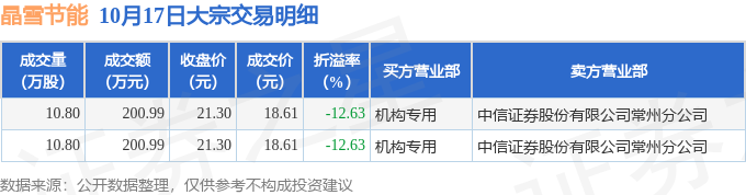 证券之星消息,10月17日晶雪节能发生大宗交易,交易数据如下: