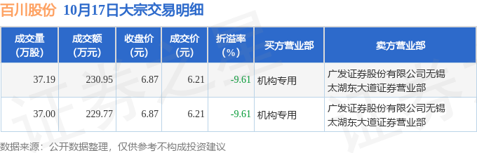 证券之星消息,10月17日百川股份发生大宗交易,交易数据如下: