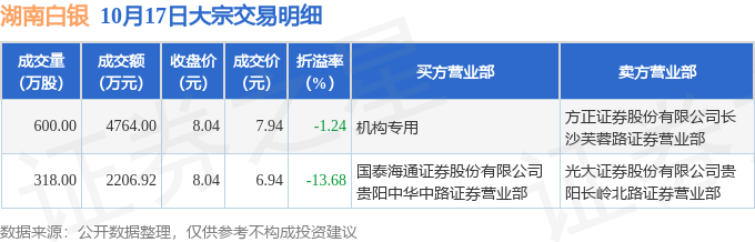 证券之星消息,10月17日湖南白银发生大宗交易,交易数据如下: