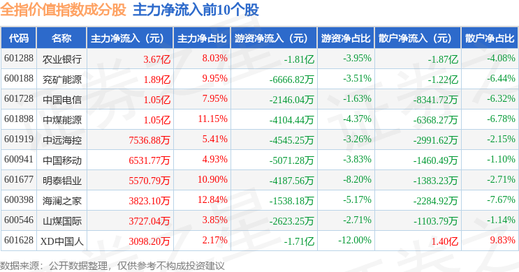 资金流向方面,全指价值(000058)指数成份股当日主力资金净流出合计89.07亿元,游资资金净流入合计18.62亿元,散户资金净流入合计70.45亿元。成份股资金流向详情见下表: