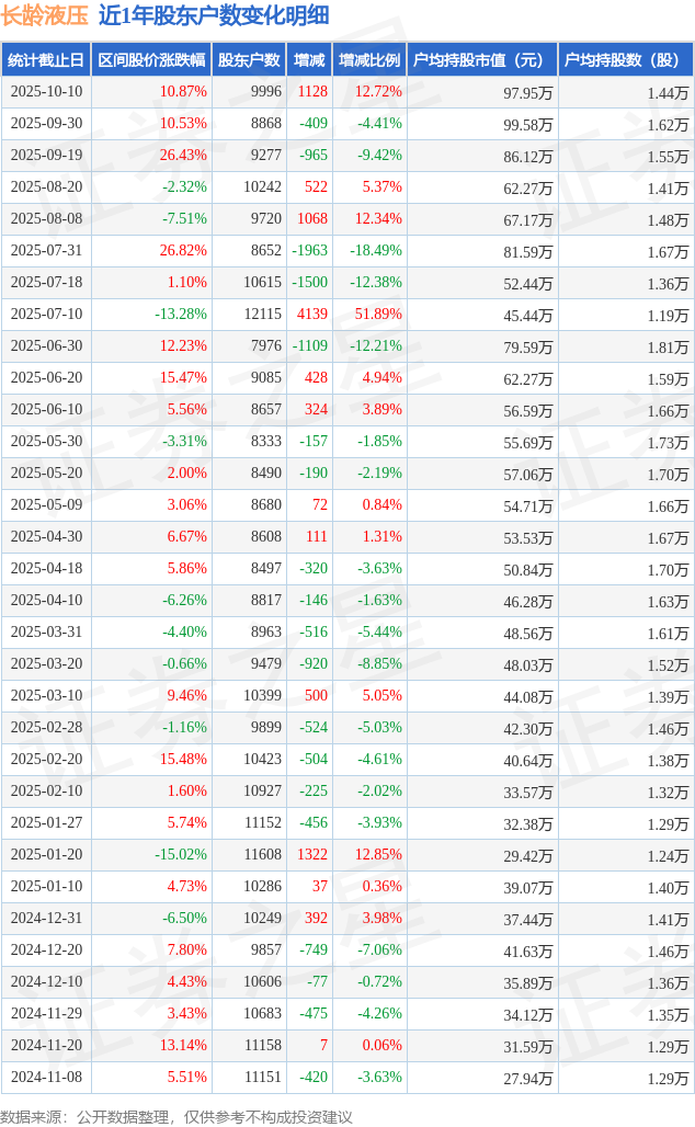 从股价来看,2025年9月30日至2025年10月10日,长龄液压区间涨幅为10.87%,在此期间股东户数增加1128.0户,增幅为12.72%。