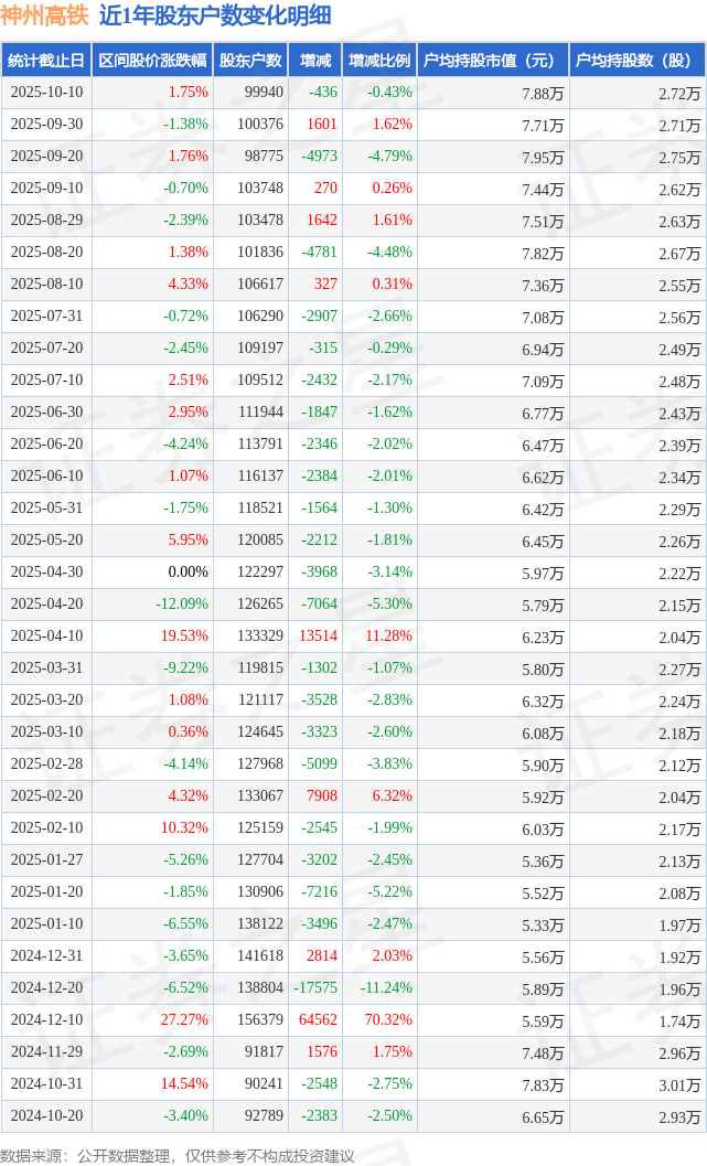 从股价来看,2025年9月30日至2025年10月10日,神州高铁区间涨幅为1.75%,在此期间股东户数减少436.0户,减幅为0.43%。