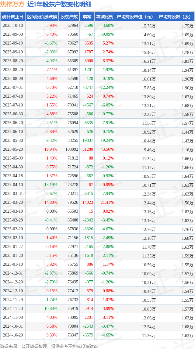 从股价来看,2025年9月30日至2025年10月10日,焦作万方区间涨幅为3.94%,在此期间股东户数减少2596.0户,减幅为3.68%。