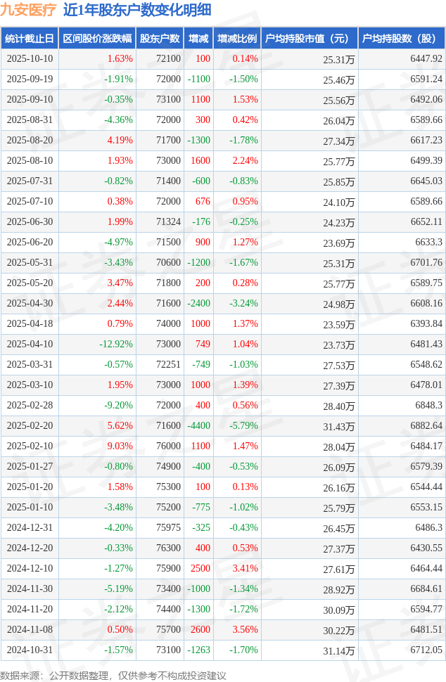 从股价来看,2025年9月19日至2025年10月10日,九安医疗区间涨幅为1.63%,在此期间股东户数增加100.0户,增幅为0.14%。