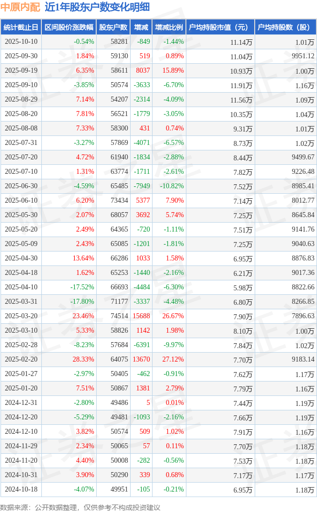 从股价来看,2025年9月30日至2025年10月10日,中原内配区间跌幅为0.54%,在此期间股东户数减少849.0户,减幅为1.44%。